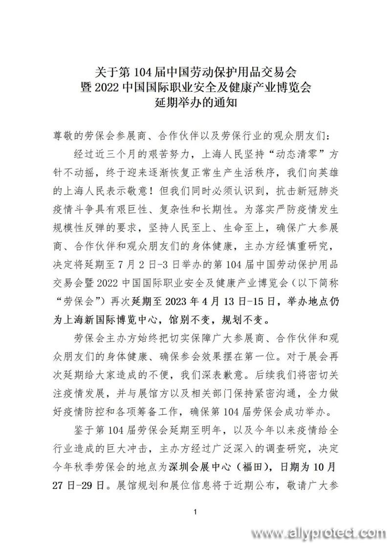 經(jīng)過近三個月的艱苦努力,上海人民堅持“動態(tài)清零”方針不動搖,終于迎來逐漸恢復正常生產(chǎn)生活秩序,我們向英雄的上海人民表示敬意!但我們同時必須認識到,抗擊新冠肺炎疫情斗爭具有艱巨性、復雜性和長期性。為落實嚴防疫情發(fā)生規(guī)模性反彈的要求,堅持人民至上、生命至上,確保廣大參展商、合作伙伴和觀眾朋友們的身體健康,主辦方經(jīng)慎重研究,決定將延期至7月2日-3日舉辦的第104屆中國勞動保護用品交易會暨2022中國國際職業(yè)安全及健康產(chǎn)業(yè)博覽會(以下簡稱“勞保會”)再次延期至2023年4月13日-15日,舉辦地點仍為上海新國際博覽中心,館別不變,規(guī)劃不變。